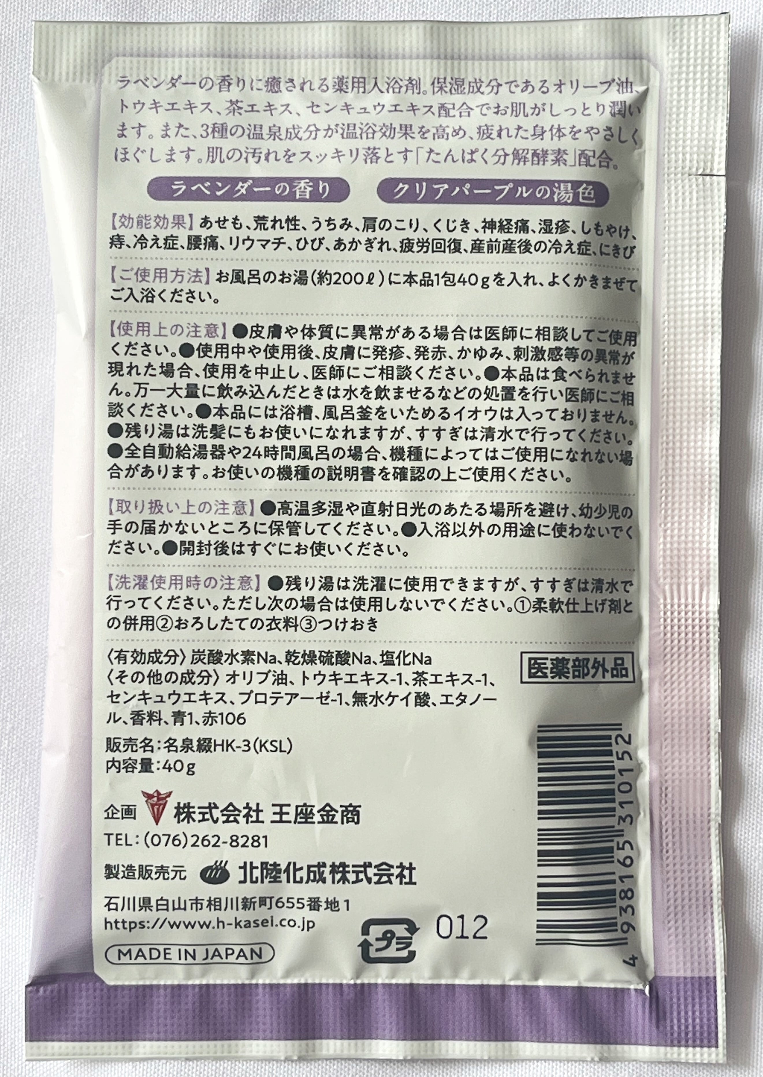 使用方法 浴槽のお湯(200リットル)に対し本品1包(40g)を入れ、よく溶かしてからご入浴ください。