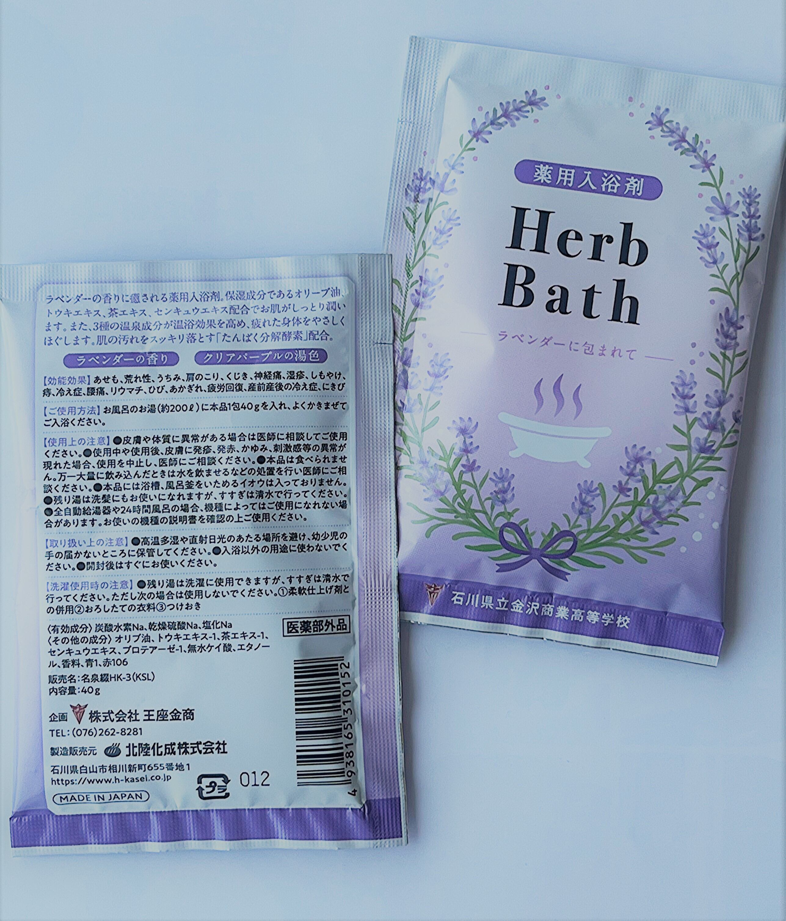 金沢商業生が開発した、心地よいラベンダーの香りが楽しめる入浴剤、Harb Bath20包セット。香りの持続性を追求しました。お風呂に浸かるだけで、疲れた心と身体をゆったり癒してくれます。リラックス効果や保湿成分をバランス良く配合し、入浴時に心地よい香りを楽しめます。このセットは令和4年度の新商品です。
